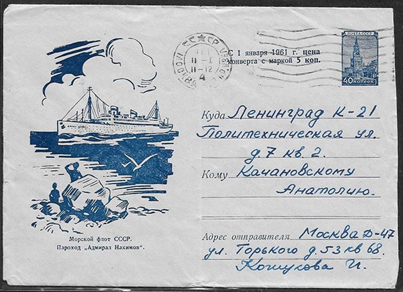 ХМК 60-36 Морской флот СССР. Пароход "Адмирал Нахимов", 1.03.1960 г. прошел почту