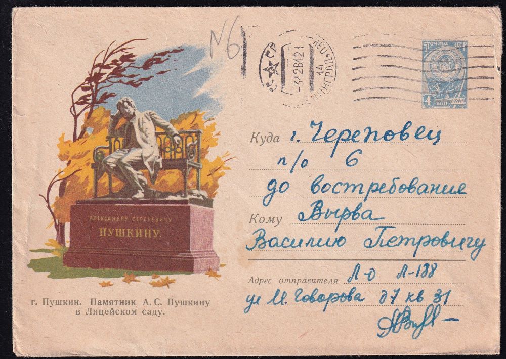 ХМК 61-168 г. Пушкин. Памятник А.С. Пушкину, 6.06.1961 год, прошел почту