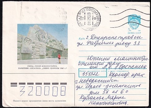 ХМК 90-117 Новороссийск. Памятник "Линия обороны 1942 г." Выпуск 20.03.1990 год, прошел почту