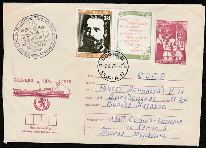 ХМК Болгарии. "Радецкий" - пароход, один из символов освобождения Болгарии от турок, спецгашение, 1976 год, п/почту. СГ: День Христо Ботева и погибших в борьбе против капитализма и фашизма, 02.06.1976 год, София.