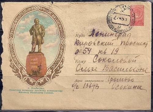 ХМК. Ленинград. Памятник М.И. Глинке, 03.12.1958 год, № 58-220, прошел почту