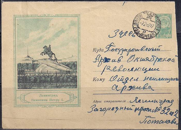 ХМК. Ленинград. Памятник Петру Первому, 06.06.1961 год, № 61 - 166, прошел почту