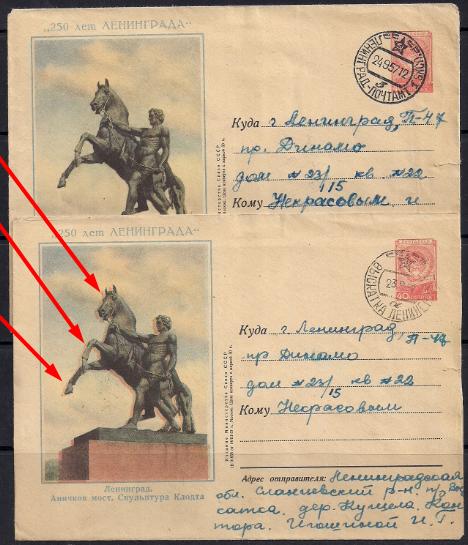 ХМК. Ленинград. РАЗНОВИДНОСТЬ. Скульптура Клодта, № 57-34, 14.03.1957 год, прошел почту. Двойная печать, сдвиг красного цветана нижнем конверте