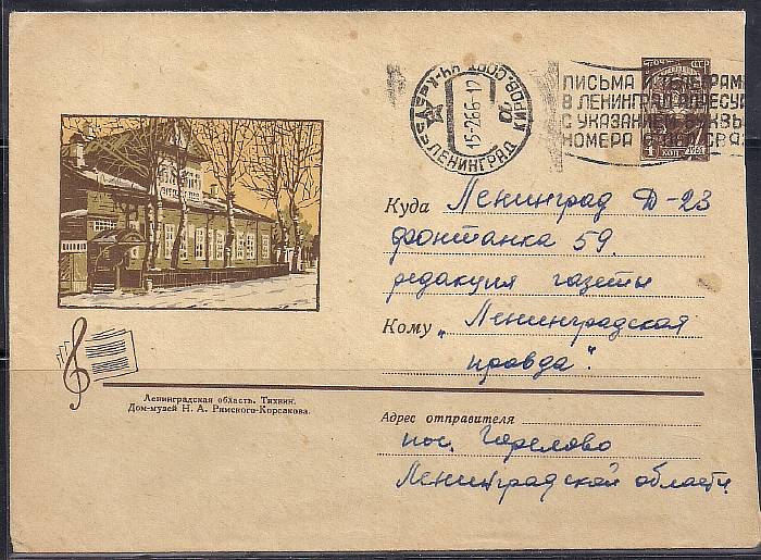 ХМК. Ленинградская область. Тихвин. Дом-музей Н.А. Римского-Корсакова, 07.01.1965 год, № 65-15, прошел почту