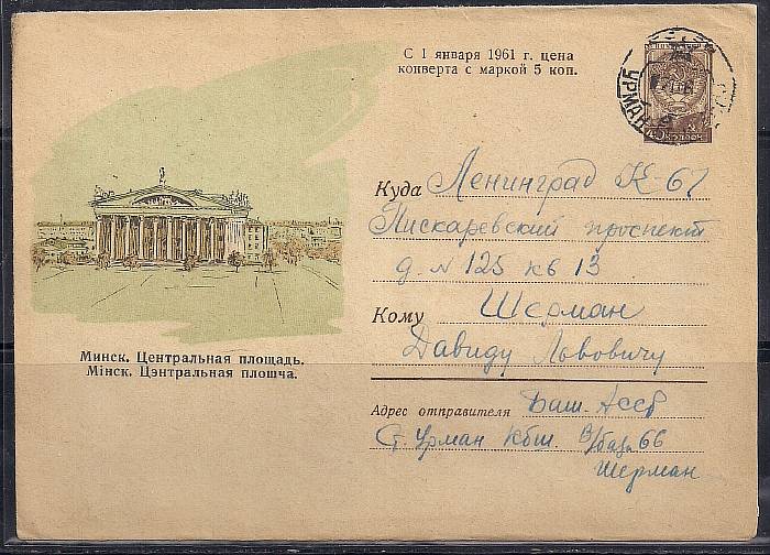 ХМК. Минск. Центральная площадь, 25.05.1960 год, № 60-121, надпечатка переоценки, прошел почту