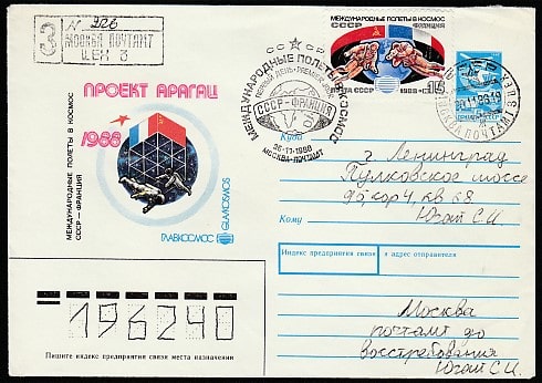 ХМК с гашением первого дня. Международные полёты в космос, СССР - Франция, 26.11.1988 год, Москва, почтамт, прошёл почту (+1Ю)