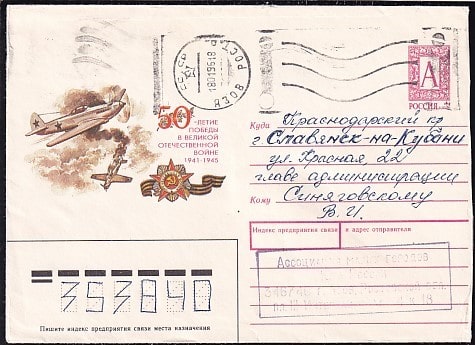 ХМК с литерой "А" 50-летие Победы в ВОВ. Авиация. Выпуск 28.12.1994 год, прошел почту (ВВ)