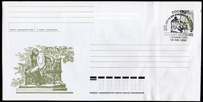 ХМК с литерой "А" и спецгашением. 200 лет со дня рождения А.С. Пушкина, 06.06.1999 год, Пушкин ГУПС