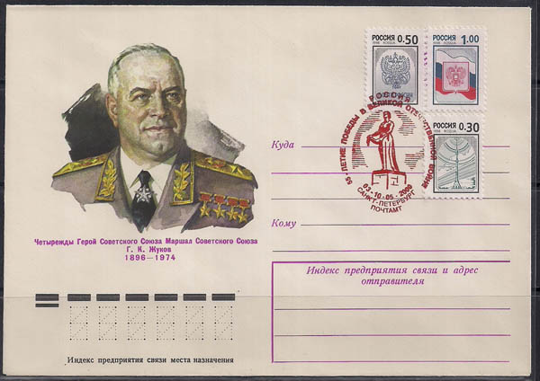 Конверт со спецгашением, Маршал СССР Г.К. Жуков. 55 лет победы в Великой Отечественной войне, 03-10.05.2000 год, Санкт-Петербург почтамт