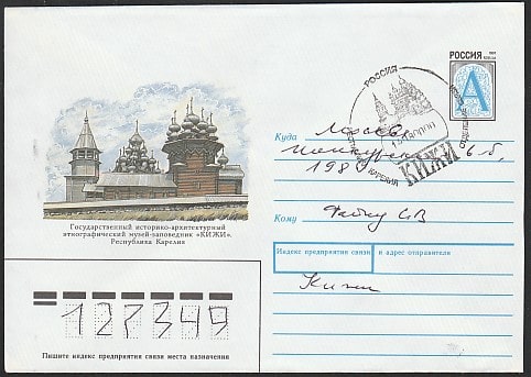 ХМК с литерой "А" и спецгашением. Музей - заповедник "КИЖИ", 14.08.2000 год, Республика Карелия, Кижи, ОС, прошёл почту