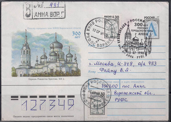 ХМК с литерой "А" и спецгашением. Поселку городского типа Анна Воронежской области 300 лет, 12.07.1998 год, почтамт Анна, заказное, прошел почту