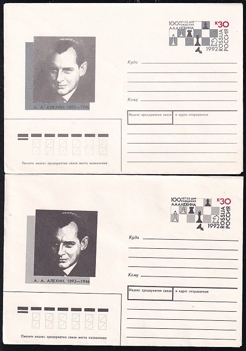 ХМК с ОМ 100 лет со дня рождения А.А. Алехина. Выпуск 22.06.1992 год, разновидность цвета