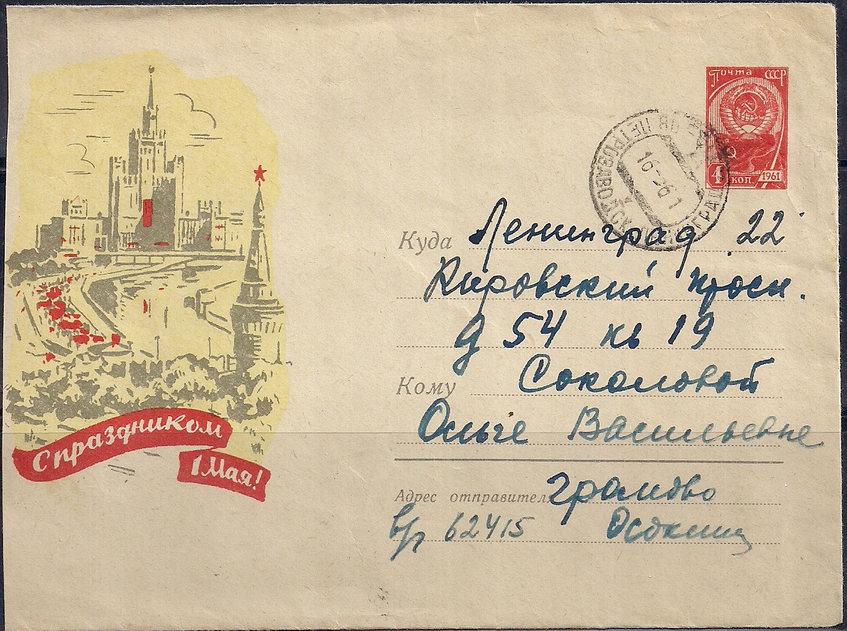 ХМК. С праздником 1 мая, 20.03.1961 год, № 61-76, прошел почту, заклеен клапан