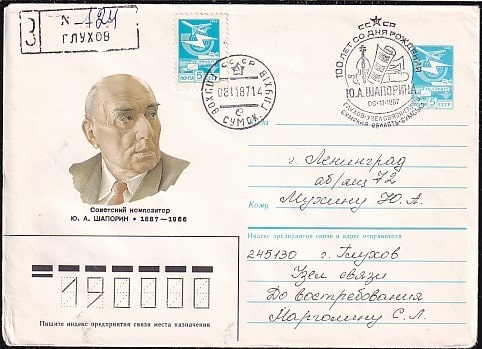 ХМК со СГ "100 лет со дня рождения Ю. А. Шапорина", 6.11.1967 год, Глухов, прошел почту