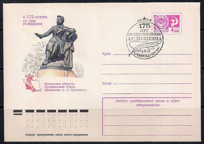 ХМК со СГ. Пушкинские Горы. Памятник А.С. Пушкину. 175 лет со дня рождения А.С. Пушкина, 06.06.1974 год, Ленинград почтамт