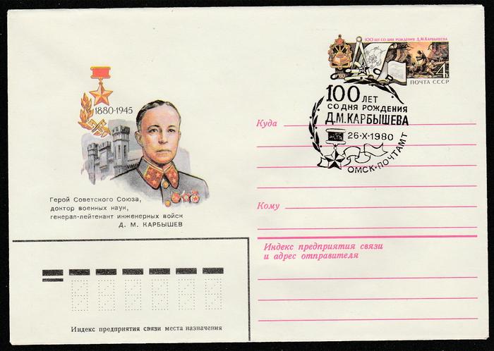 Конверт с ОМ и СГ. 100 лет со дня рождения Героя СССР Д. М. Карбышева. 26.10.1980 год. Омск.