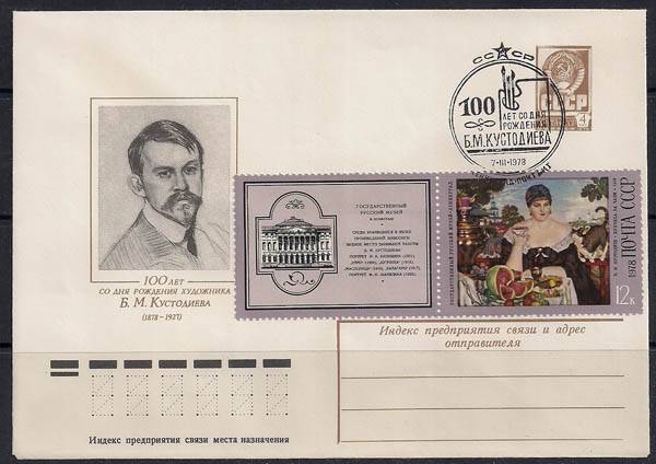 ХМК со спецгашением. 100 лет со дня рождения художника Б.М. Кустодиева, марка (ном 12), 07.13.1978 год, Ленинград почтамт