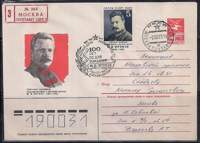 ХМК со спецгашением. 100 лет со дня рождения М.В. Фрунзе, первый день, заказное, 02.02.1985 год, Москва почтамт, прошел почту