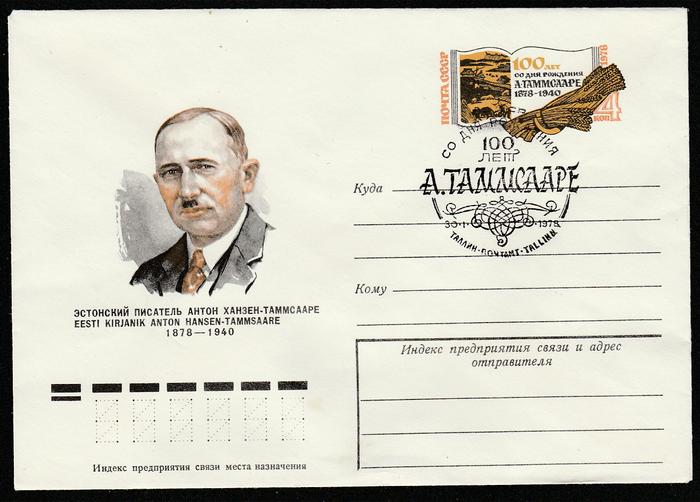Конверт с ОМ и спецгашением. 100 лет со дня рождения писателя А. Таммсааре. 30.01.1978 год. Таллин.
