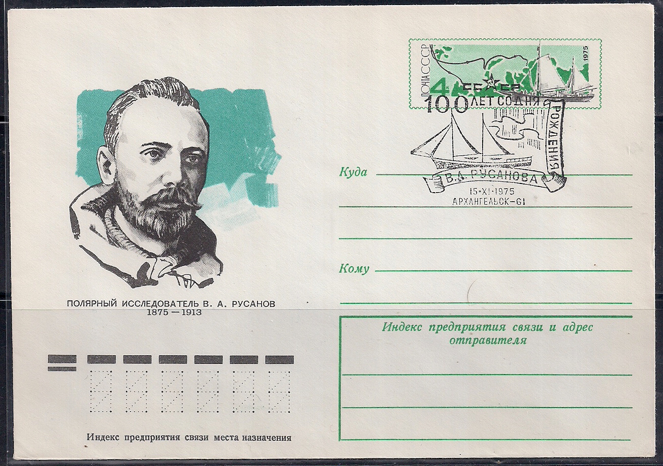 Конверт с ОМ и спецгашением. 100 лет со дня рождения полярного исследователя В.А. Русанова, № 75-489, гашение 15.11.1975 год, Архангельск-61