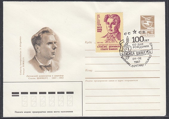 ХМК со спецгашением - 100 лет со дня рождения Стасиса Шимкуса, Вильнюс 4.02.1987 год