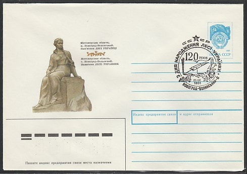 ХМК со спецгашением. 120 лет со дня рождения украинской поэтессы Леси Украинки, 25.02.1991 год, Новоград-Волынский-8 (Ю)