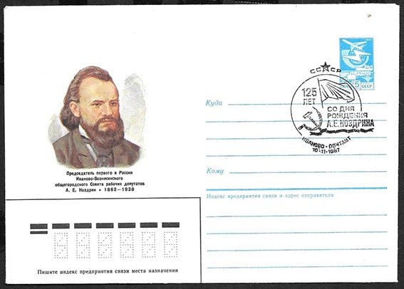 ХМК со спецгашением - 125 лет со дня рождения А.Е. Ноздрина, Иваново, 10.11.1987 год