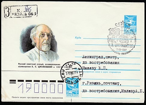 ХМК со спецгашением. 130 лет со дня рождения К.Э. Циолковского, 17.09.1987 год, Рязань, почтамт, прошёл почту (+1Ю)