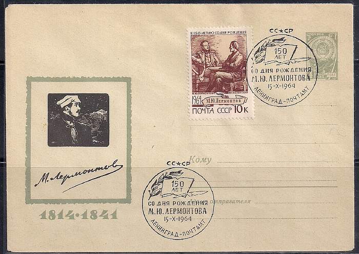 ХМК со спецгашением. 150 лет со дня рождения М.Ю. Лермонтова, № 64 - 371, гашение 15.10.1964 год, Ленинград почтамт