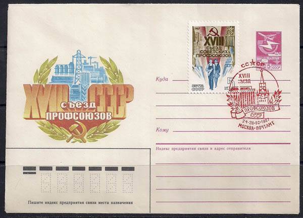 ХМК со спецгашением. 18-й съезд профсоюзов СССР, 24-28.02.1987 год, Москва почтамт (с маркой)