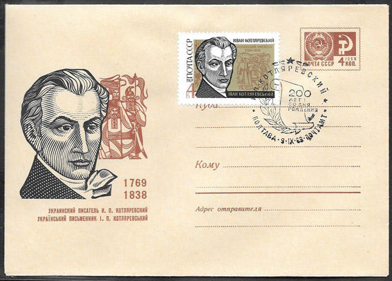 ХМК со спецгашением - 200 лет со дня рождения, И.П. Котляревский. Полтава. 1969 год