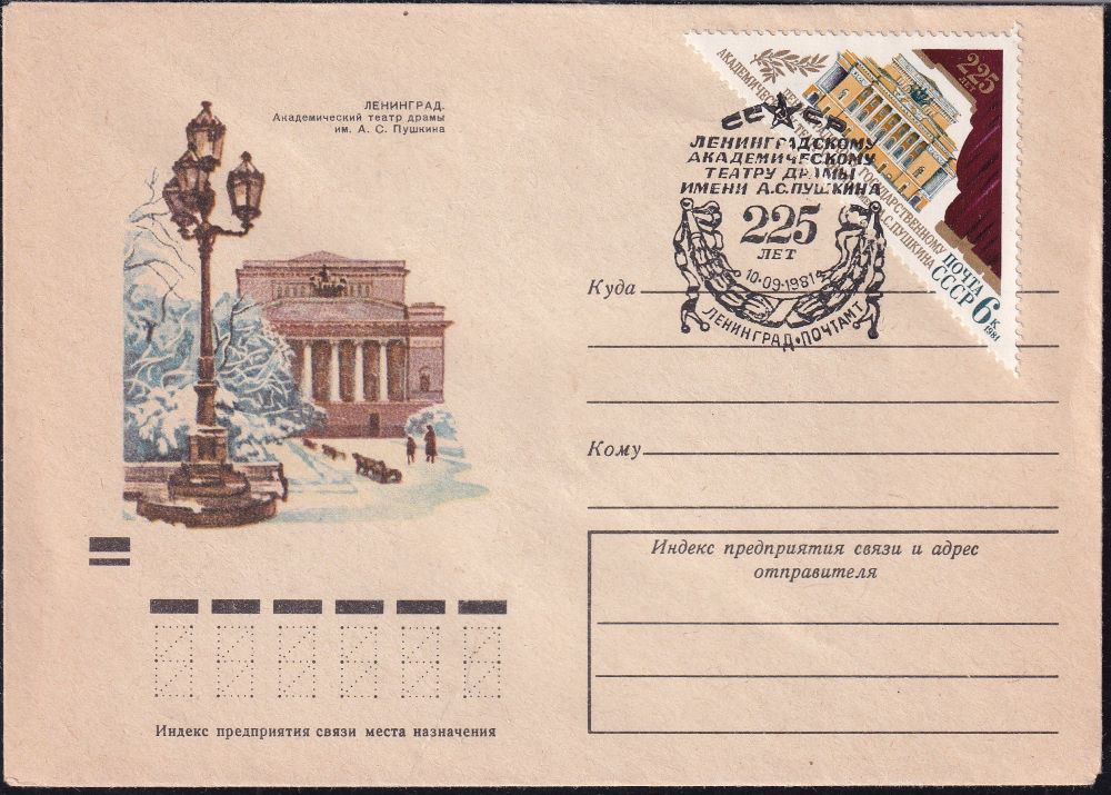 ХМК со спецгашением - 225 лет Ленинградскому театру драмы им. А. С. Пушкину, 10.09.1981 год, Ленинград