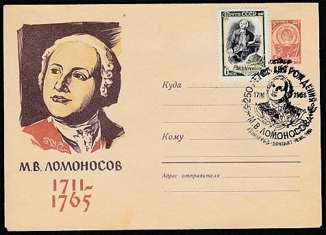 ХМК со спецгашением. 250 лет со дня рождения М.В. Ломоносова, 19.11.1961 год, Ленинград, почтамт
