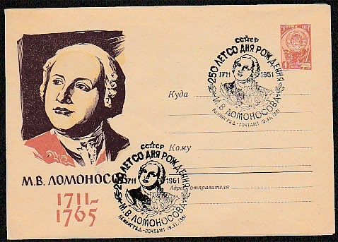ХМК со СГ. 250 лет со дня рождения М.В. Ломоносова, 19.11.1961 год, Ленинград, почтамт.