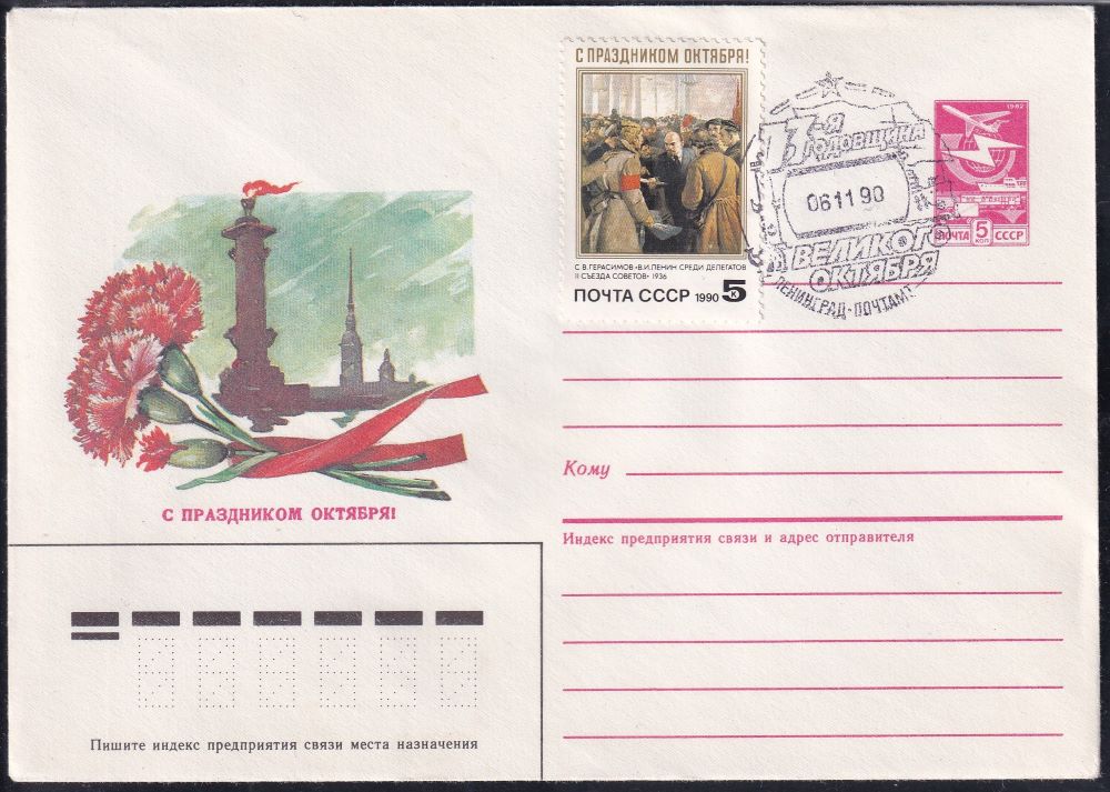 ХМК со спецгашением - 73-я годовщина Великого октября (Ростральная колонна), 6.11.1990 год, Ленинград