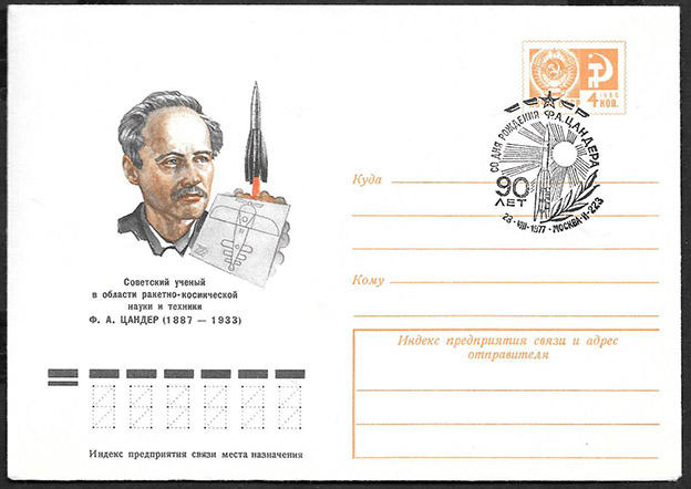 ХМК со спецгашением - 90 лет со дня рождения Ф.А. Цандера, 1977 год