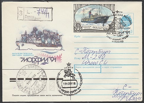 ХМК со спецгашением. Филвыставка "Морфил-91", СПб, почтамт, 12-20.10.1991 год, прошёл почту (Ю)