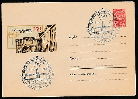 ХМК со спецгашением. Кунсткамера. 250 лет первому русскому музею, 11.08.1964 год, Ленинград, В-164