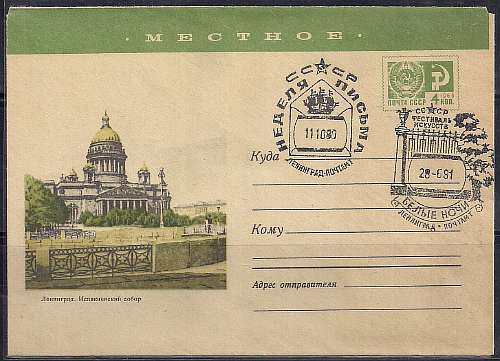 ХМК со спецгашением. Ленинград. Исаакиевский собор. Местное. Спецгашение Фестиваль искусств "Белые ночи" 28.06.1981 год, Ленинград почтамт