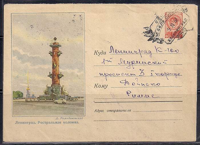 ХМК со спецгашением. Ленинград. Ростральная колонна. "Неделя письма". 09.10.58 год. Калининград, № 58-86, прошёл почту
