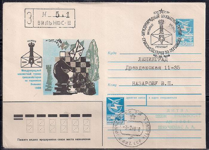 ХМК со спецгашением. Международный шахматный турнир гроссмейстеров по переписке, 03.02.1988 год, Вильнюс почтамт, заказное, прошел почту