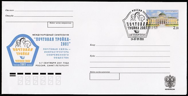 Конверт с ОМ и гашением. Международный симпозиум "Почтовая тройка-2001", 04-07.09.2001 год, СПб, почтамт