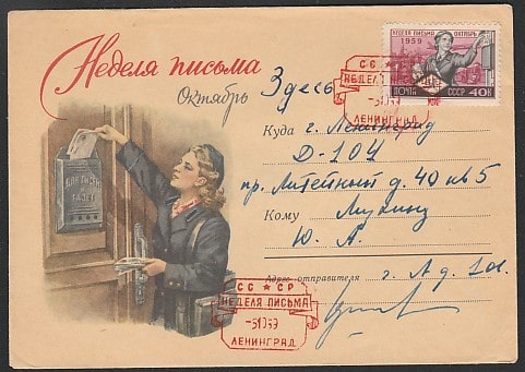 ХМК со спецгашением. Неделя письма, 05.10.1959 год, Ленинград, п/почту