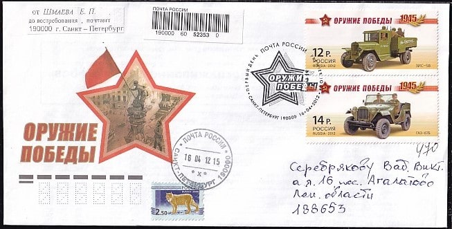 ХМК со спецгашением "Оружие Победы", 16.04.2012 год, Санкт-Петербург, прошел почту (ВВ)