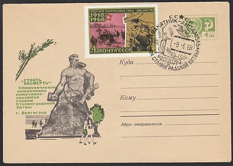 ХМК со спецгашением. Памятник - ансамбль героям Сталинградской битвы, 09.05.1968 год, Волгоград, почтамт