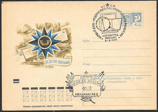 ХМК со спецгашением Первый день "Недели письма". Калининград 09.10.1972 г