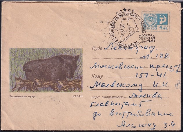 ХМК со спецгашением "Столетие периодического закона Д.И. Менделеева", 23-27.09.1969 год, Москва, прошел почту (ВВ)