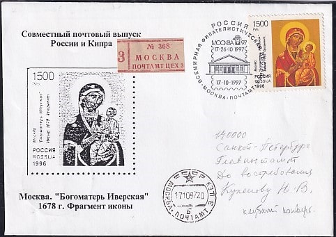 ХМК со спецгашением "Всемирная фил. выставка Москва-97", 17.10.1997 год, Москва, прошёл почту
