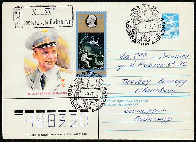 ХМК со спецгашением. Ю.А. Гагарин, 09.03.1984 год, космодром Байконур, прошёл почту (Ю)