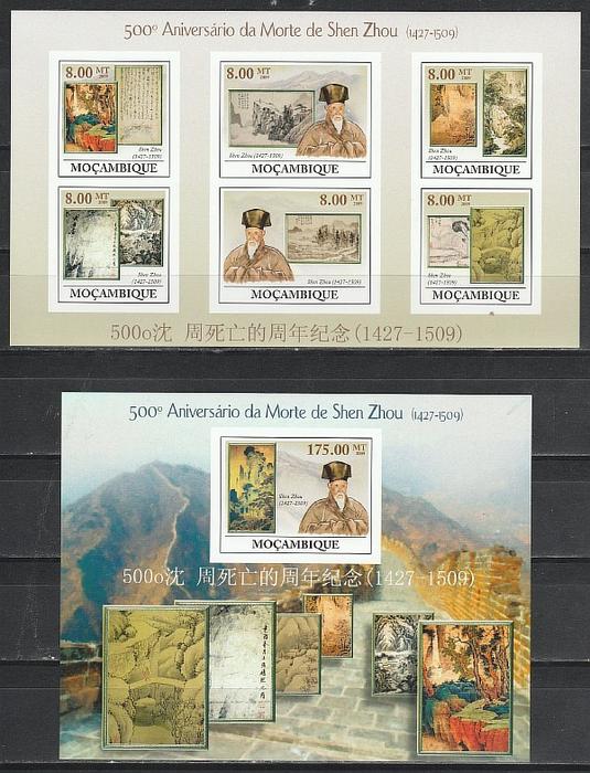 Художник Шень Джоу, Живопись, Мозамбик 2009, малый лист + блок без зубцов